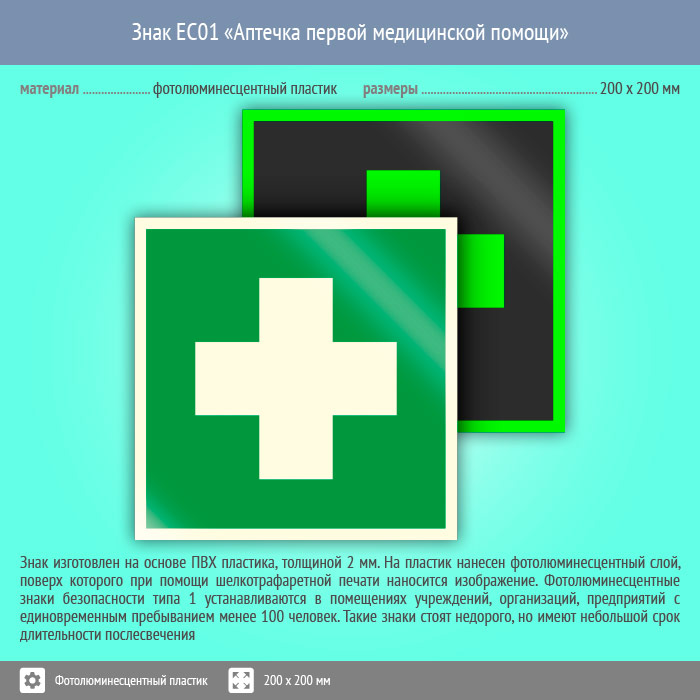 Знак EC01 «Аптечка первой медицинской помощи» (фотолюминесцентный пластик, 200х200 мм) в Рыбинске купить