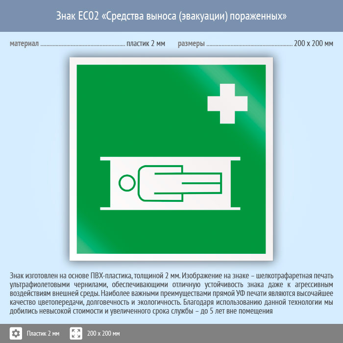 Знак EC02 «Средства выноса (эвакуации) пораженных» (пластик, 200х200 мм) в Рыбинске купить