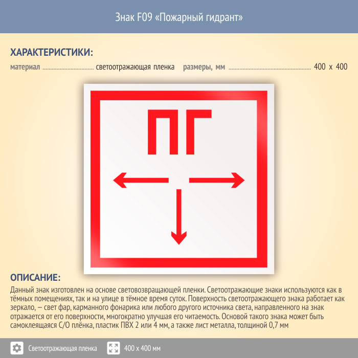 Знак F09 «Пожарный гидрант» (светоотражающая пленка, 400х400 мм) в Рыбинске купить
