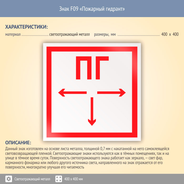 Знак F09 «Пожарный гидрант» (светоотражающий металл, 400х400 мм) в Рыбинске купить