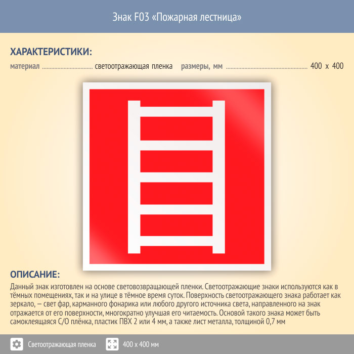 Знак F03 «Пожарная лестница» (светоотражающая пленка, 400х400 мм) в Рыбинске купить