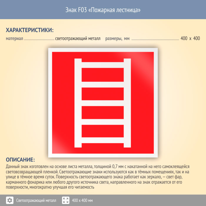 Знак F03 «Пожарная лестница» (светоотражающий металл, 400х400 мм) в Рыбинске купить