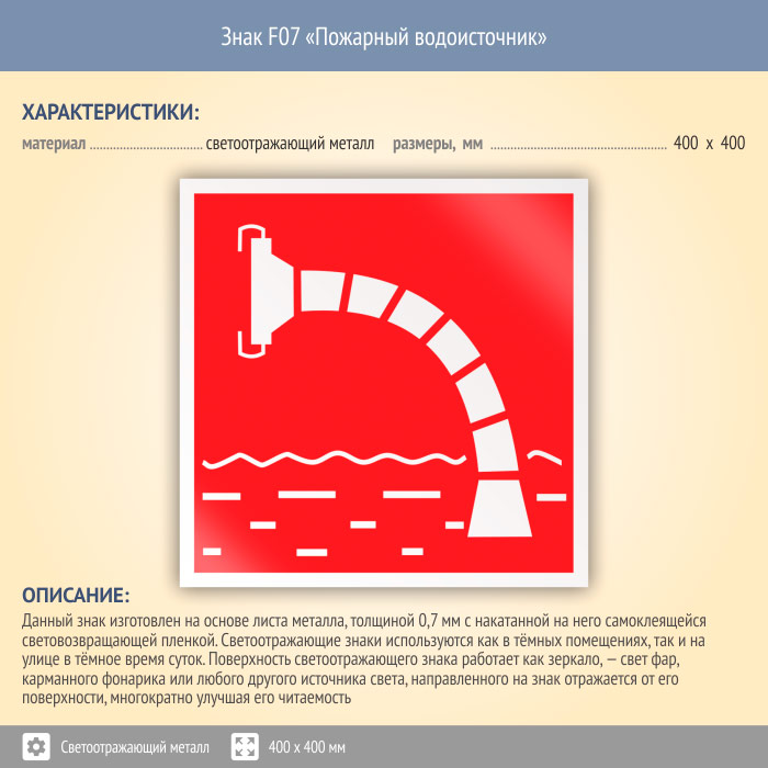 Знак F07 «Пожарный водоисточник» (светоотражающий металл, 400х400 мм) в Рыбинске купить