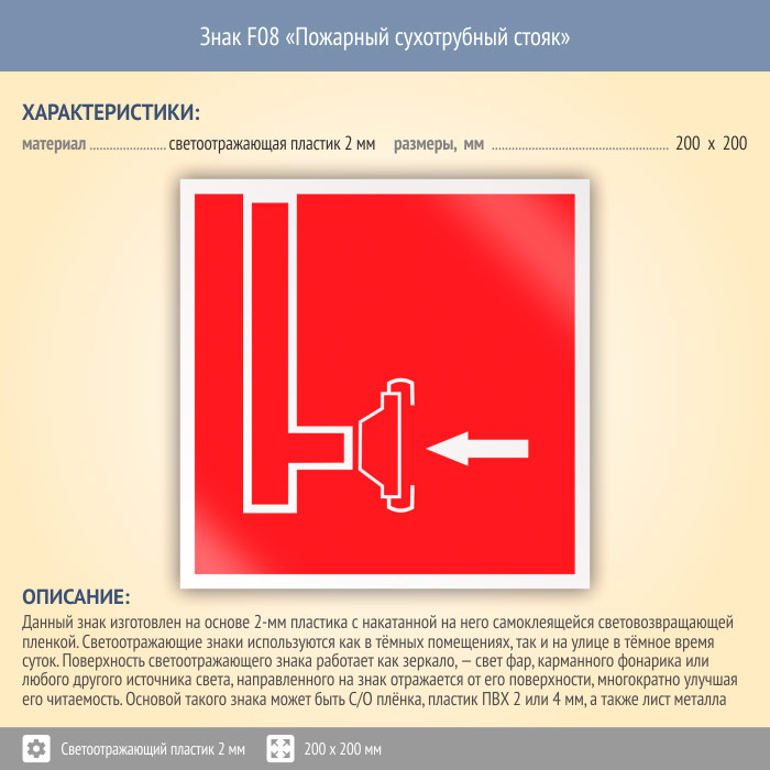 Знак F08 «Пожарный сухотрубный стояк» (светоотражающий пластик, 200х200 мм) в Рыбинске купить