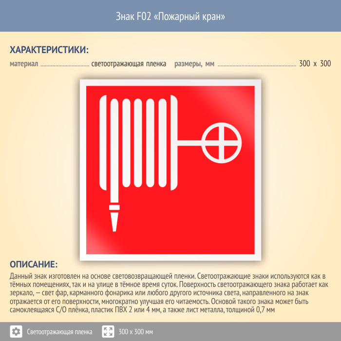 Знак F02 «Пожарный кран» (светоотражающая пленка, 300х300 мм) в Рыбинске купить