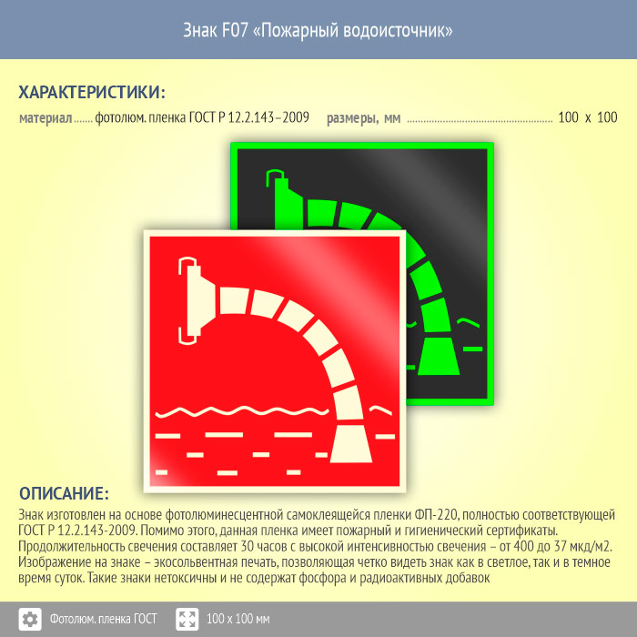 Знак F07 «Пожарный водоисточник» (фотолюминесцентная пленка ГОСТ 34428-2018, 100х100 мм) в Рыбинске купить