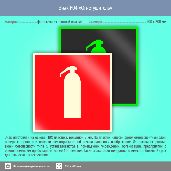 Знак F04 «Огнетушитель» (фотолюминесцентный пластик, 200х200 мм) в Рыбинске купить