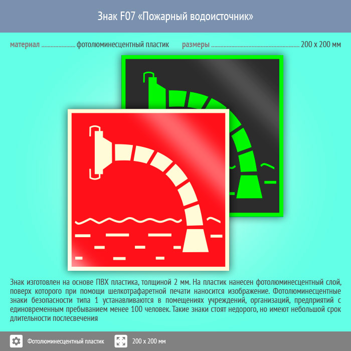 Знак F07 «Пожарный водоисточник» (фотолюминесцентный пластик, 200х200 мм) в Рыбинске купить