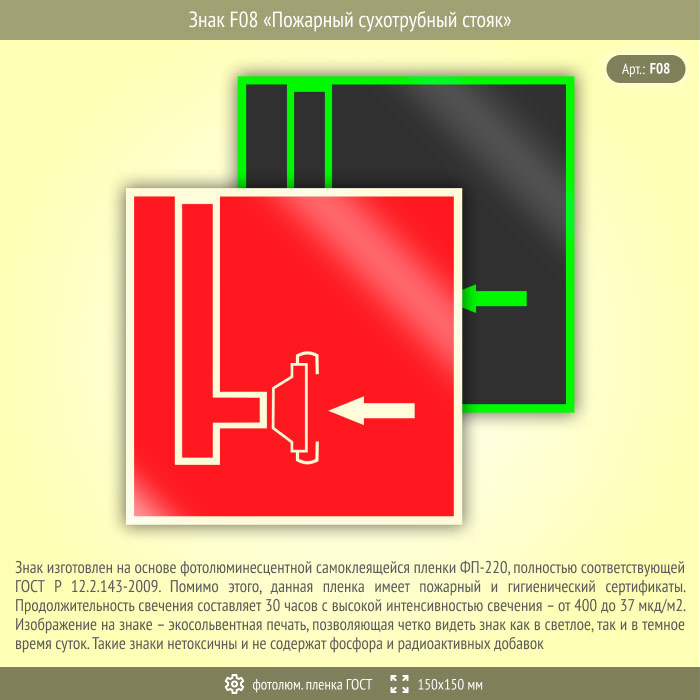 Знак F08 «Пожарный сухотрубный стояк» (фотолюминесцентная пленка ГОСТ 34428-2018, 150х150 мм) в Рыбинске купить