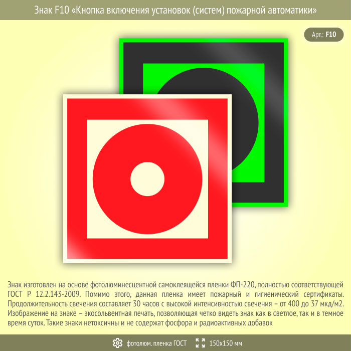 Знак F10 «Кнопка включения установок (систем) пожарной автоматики» (фотолюминесцентная пленка ГОСТ 34428-2018, 150х150 мм) в Рыбинске купить