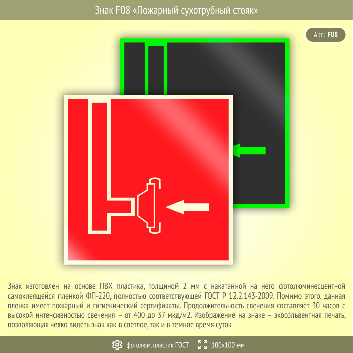 Знак F08 «Пожарный сухотрубный стояк» (фотолюминесцентный пластик ГОСТ 34428-2018, 100х100 мм) в Рыбинске купить
