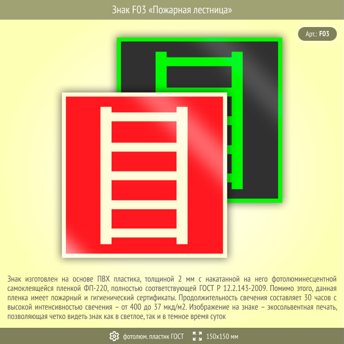 Знак F03 «Пожарная лестница» (фотолюминесцентный пластик ГОСТ 34428-2018, 150х150 мм) в Рыбинске купить