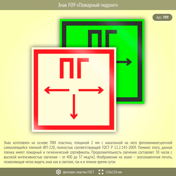 Знак F09 «Пожарный гидрант» (фотолюминесцентный пластик ГОСТ 34428-2018, 150х150 мм) в Рыбинске купить