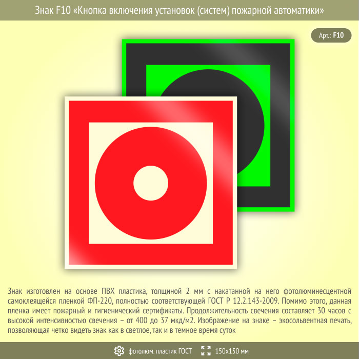 Знак F10 «Кнопка включения установок (систем) пожарной автоматики» (фотолюминесцентный пластик ГОСТ 34428-2018, 150х150 мм) в Рыбинске купить