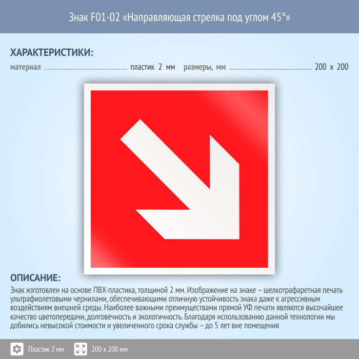 Знак F01-02 «Направляющая стрелка под углом 45°» (пластик, 200х200 мм) в Рыбинске купить