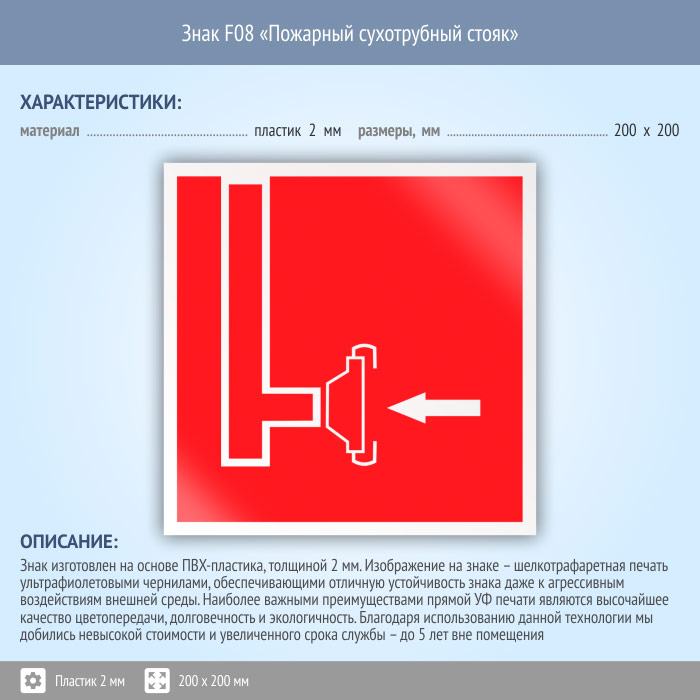 Знак F08 «Пожарный сухотрубный стояк» (пластик, 200х200 мм) в Рыбинске купить