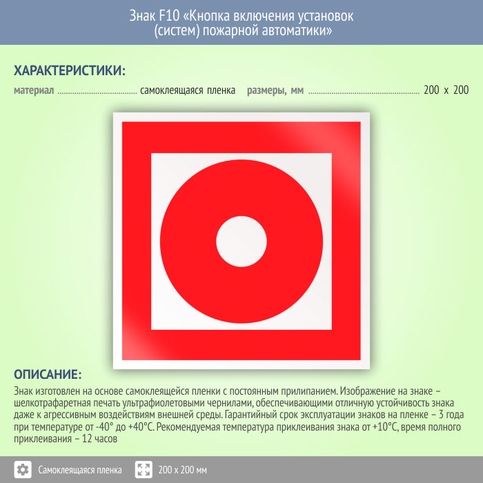 Знак F10 «Кнопка включения установок (систем) пожарной автоматики» (пленка, 200х200 мм) в Рыбинске купить