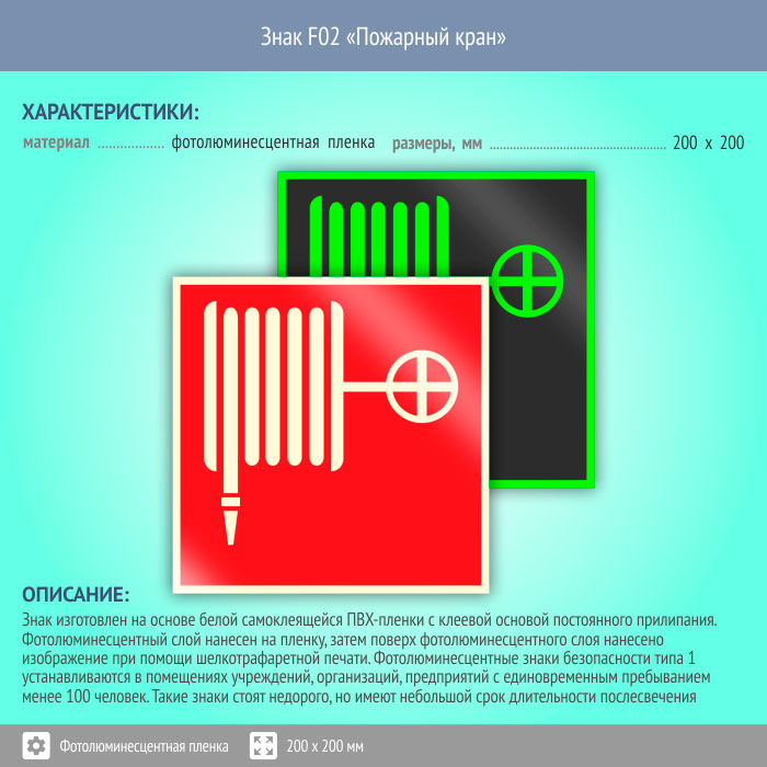 Знак F02 «Пожарный кран» (фотолюминесцентная пленка, 200х200 мм) в Рыбинске купить