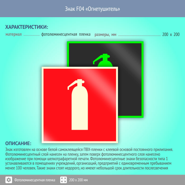 Знак F04 «Огнетушитель» (фотолюминесцентная пленка, 200х200 мм) в Рыбинске купить