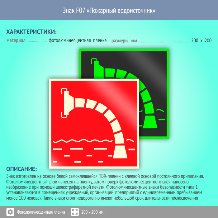 Знак F07 «Пожарный водоисточник» (фотолюминесцентная пленка, 200х200 мм) в Рыбинске купить