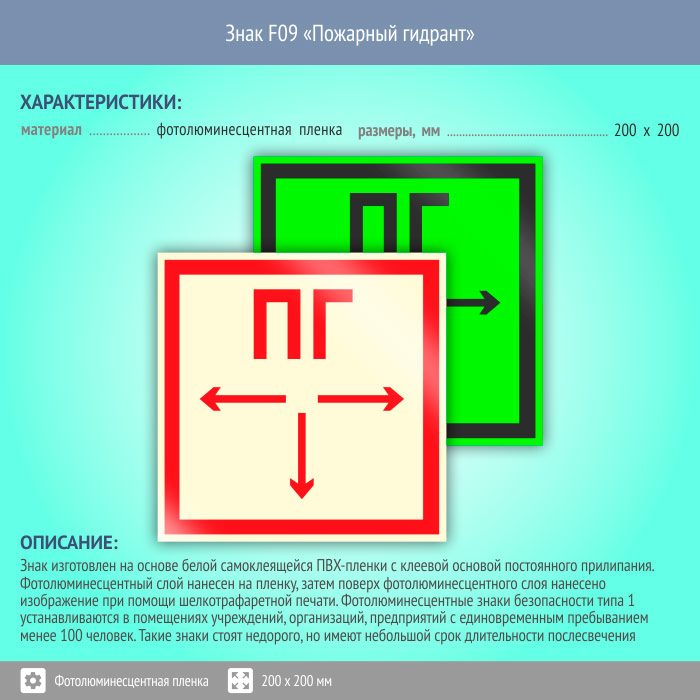 Знак F09 «Пожарный гидрант» (фотолюминесцентная пленка, 200х200 мм) в Рыбинске купить