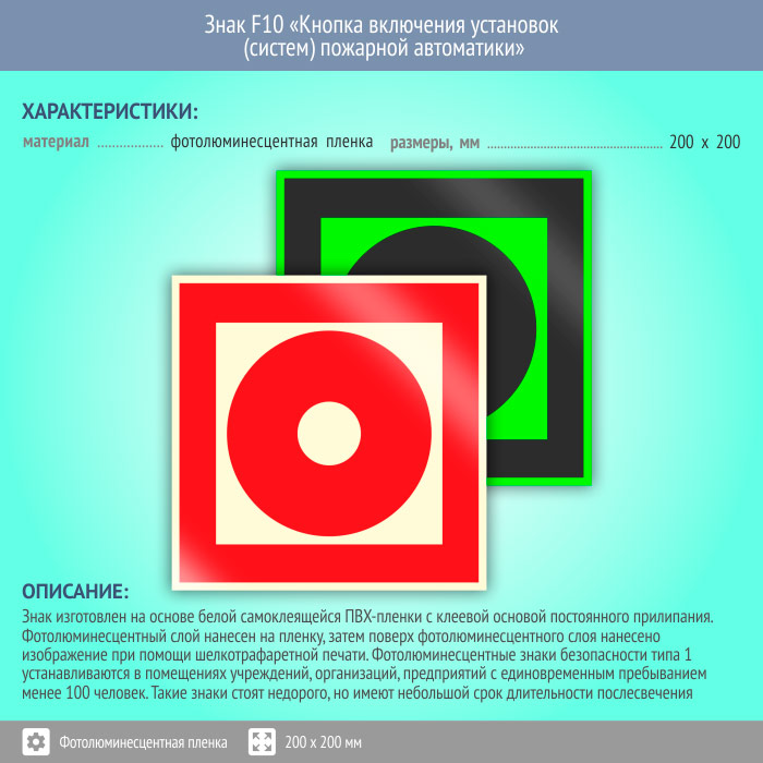 Знак F10 «Кнопка включения установок (систем) пожарной автоматики» (фотолюминесцентная пленка, 200х200 мм) в Рыбинске купить