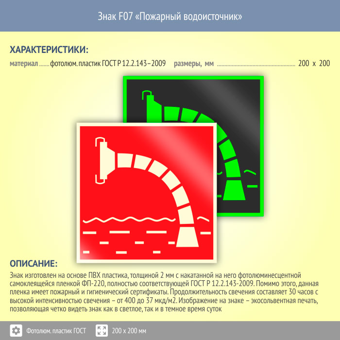 Знак F07 «Пожарный водоисточник» (фотолюминесцентный пластик ГОСТ 34428-2018, 200х200 мм) в Рыбинске купить