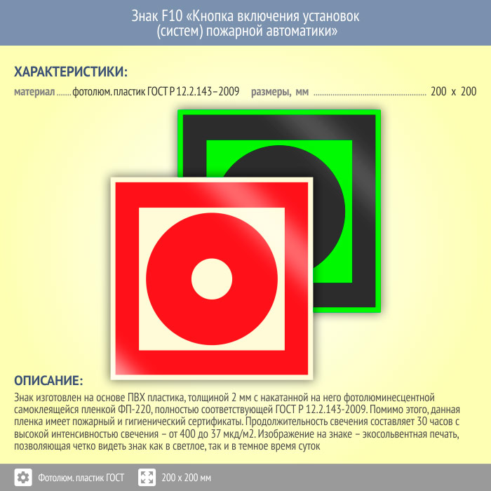 Знак F10 «Кнопка включения установок (систем) пожарной автоматики» (фотолюминесцентный пластик ГОСТ 34428-2018, 200х200 мм) в Рыбинске купить