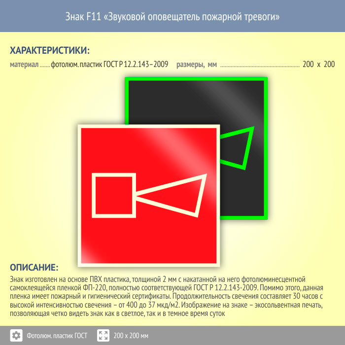 Знак F11 «Звуковой оповещатель пожарной тревоги» (фотолюминесцентный пластик ГОСТ 34428-2018, 200х200 мм) в Рыбинске купить