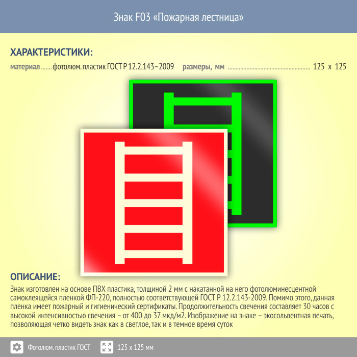 Знак F03 «Пожарная лестница» (фотолюминесцентный пластик ГОСТ 34428-2018, 125х125 мм) в Рыбинске купить