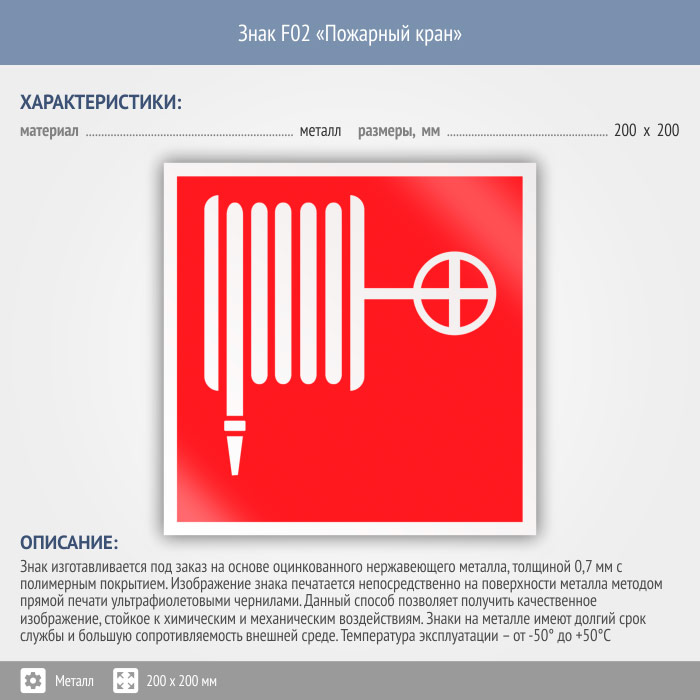 Знак F02 «Пожарный кран» (металл, 200х200 мм) в Рыбинске купить