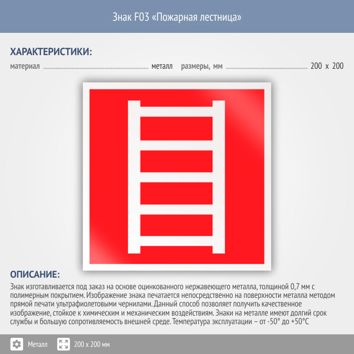 Знак F03 «Пожарная лестница» (металл, 200х200 мм) в Рыбинске купить
